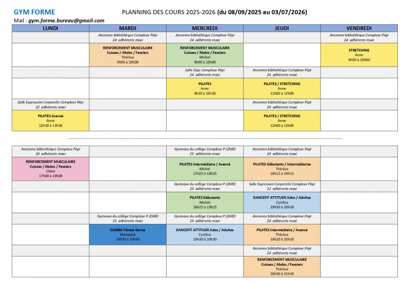• L'adhèrent s'inscrit pour 1 à 3 cours par semaine. Les cours choisis restent les mêmes pour toute l'année. Il n'est pas possible de changer de créneau en fonction des semaines.